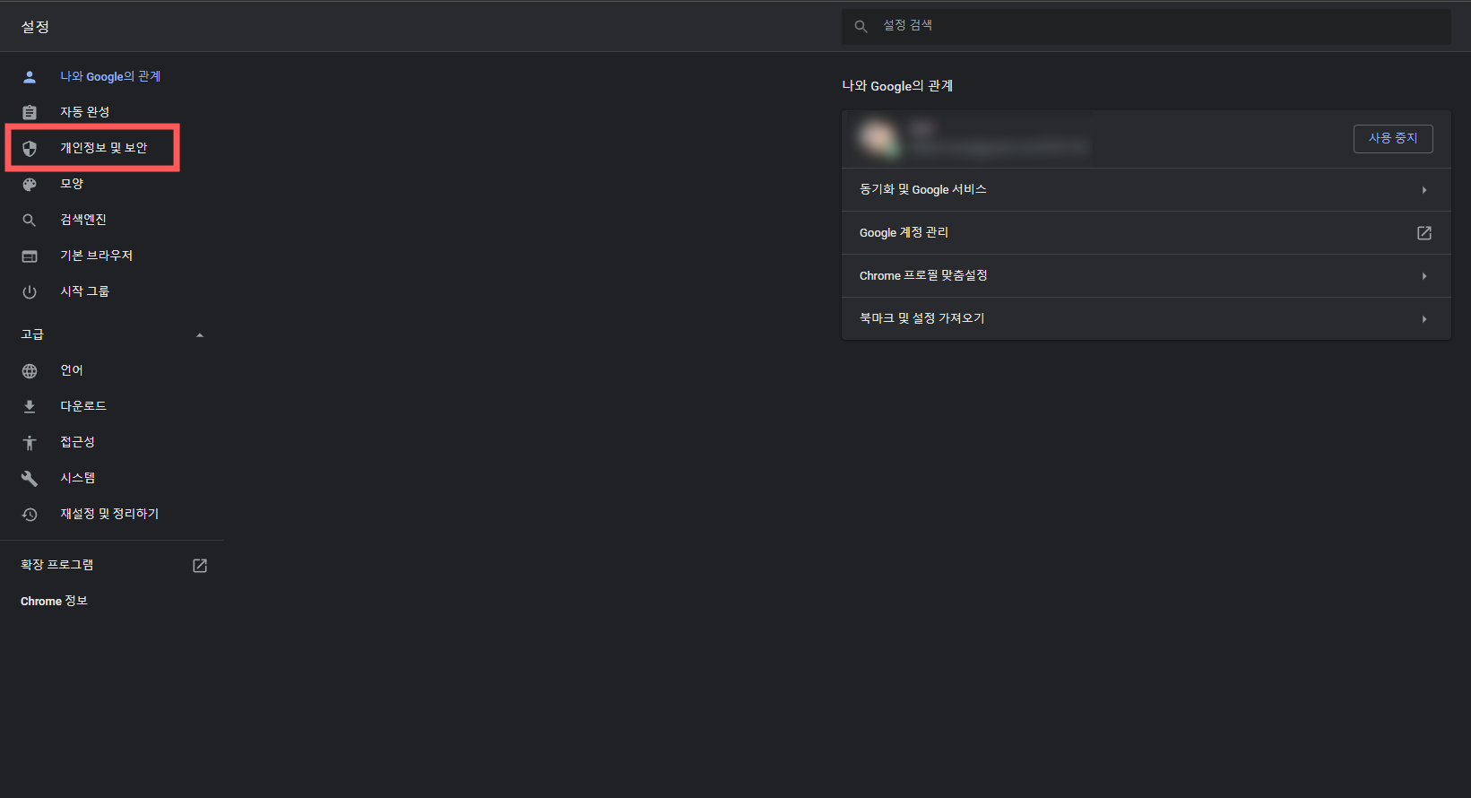 설정 창이 크롬 전체에 열리게 되며, 거기서 왼쪽의 개인정보 및 보안을 눌러주자.