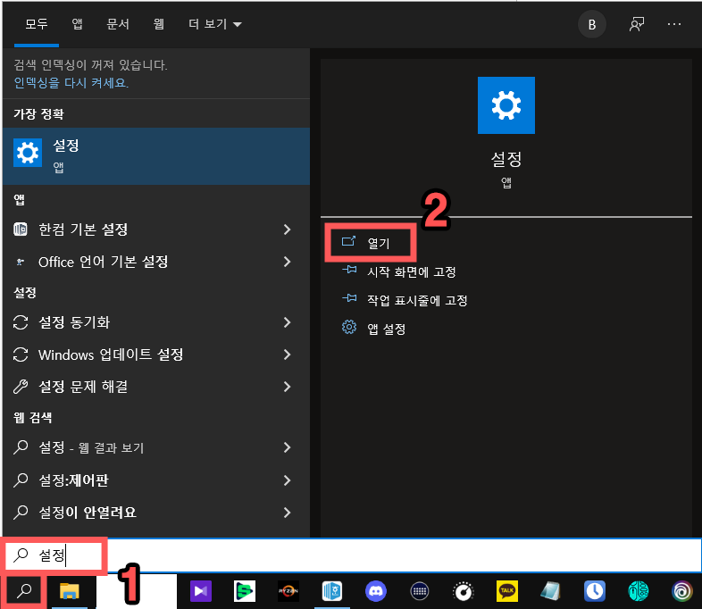 작업표시줄 왼쪽 맨 끝(시작) - 왼쪽 위의 톱니바퀴 클릭 또는 작업표시줄 왼쪽 돋보기(검색) - 설정 검색