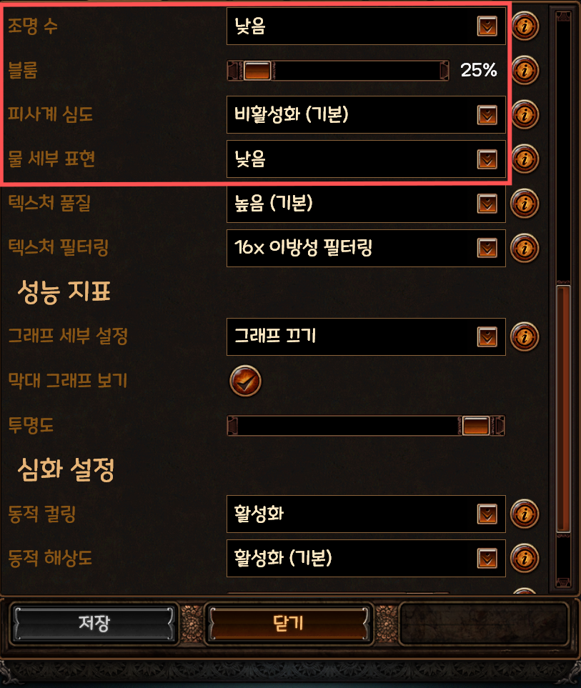이 게임은 오브젝트/파티클 개채수가 많기 때문에 이 옵션만 낮춰줘도 게임이 쾌적하게 변한다.