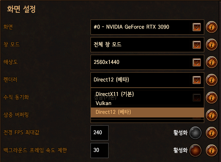 Vulkan도 좋지만 자신의 컴퓨터 사양이 높다 생각된다면 Direct12(베타) 사용을 추천한다.