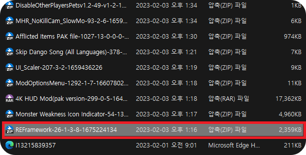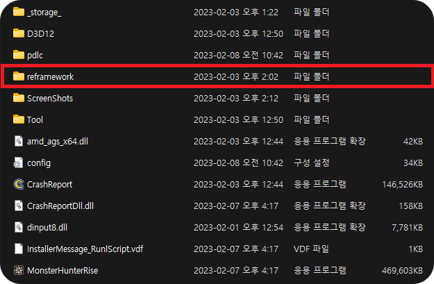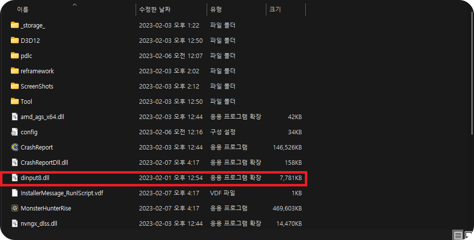 dinput8.dll 이 파일을 몬스터 헌터 라이즈가 설치된 폴더에 넣으면 된다.