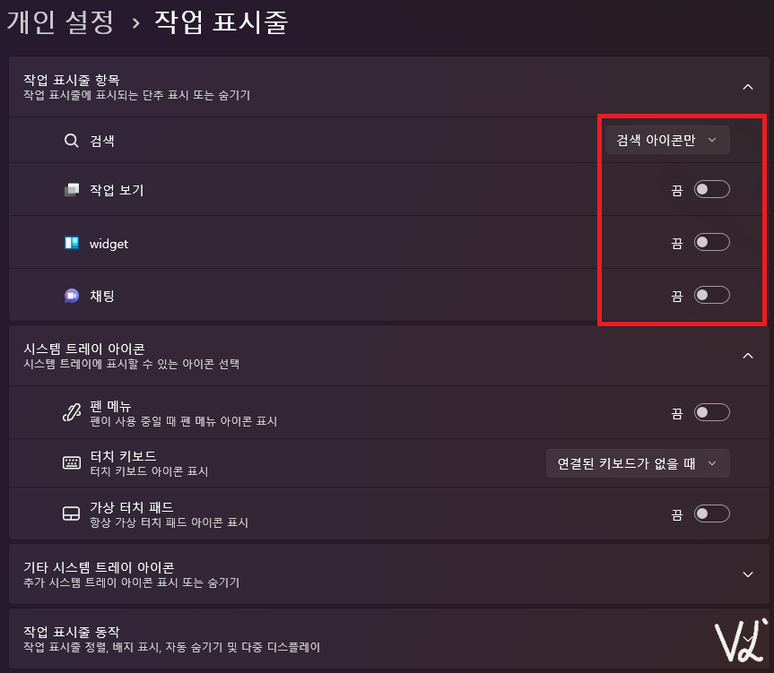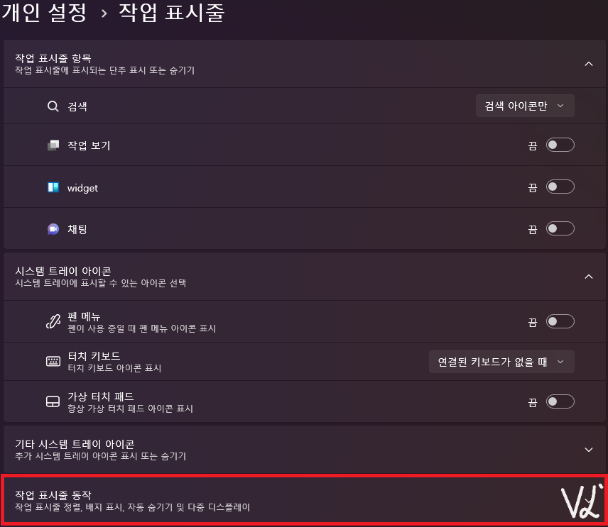 (작업표시줄 빈 공간 우클릭 후 작업표시줄 설정으로 들어와도 된다.)