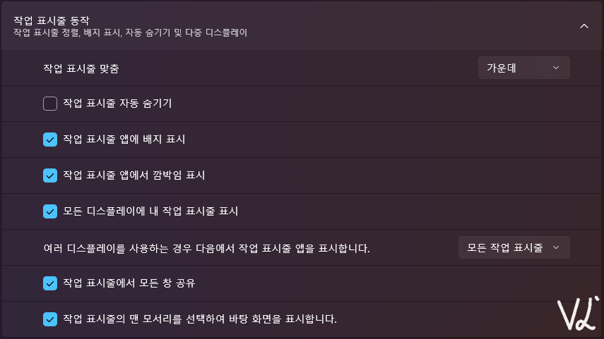 만약 작업 표시줄 아이콘이 가운데 있는 것이 싫다면 작업 표시줄 맞춤을 [가운데]에서 [왼쪽]으로 바꾸면 된다.\
