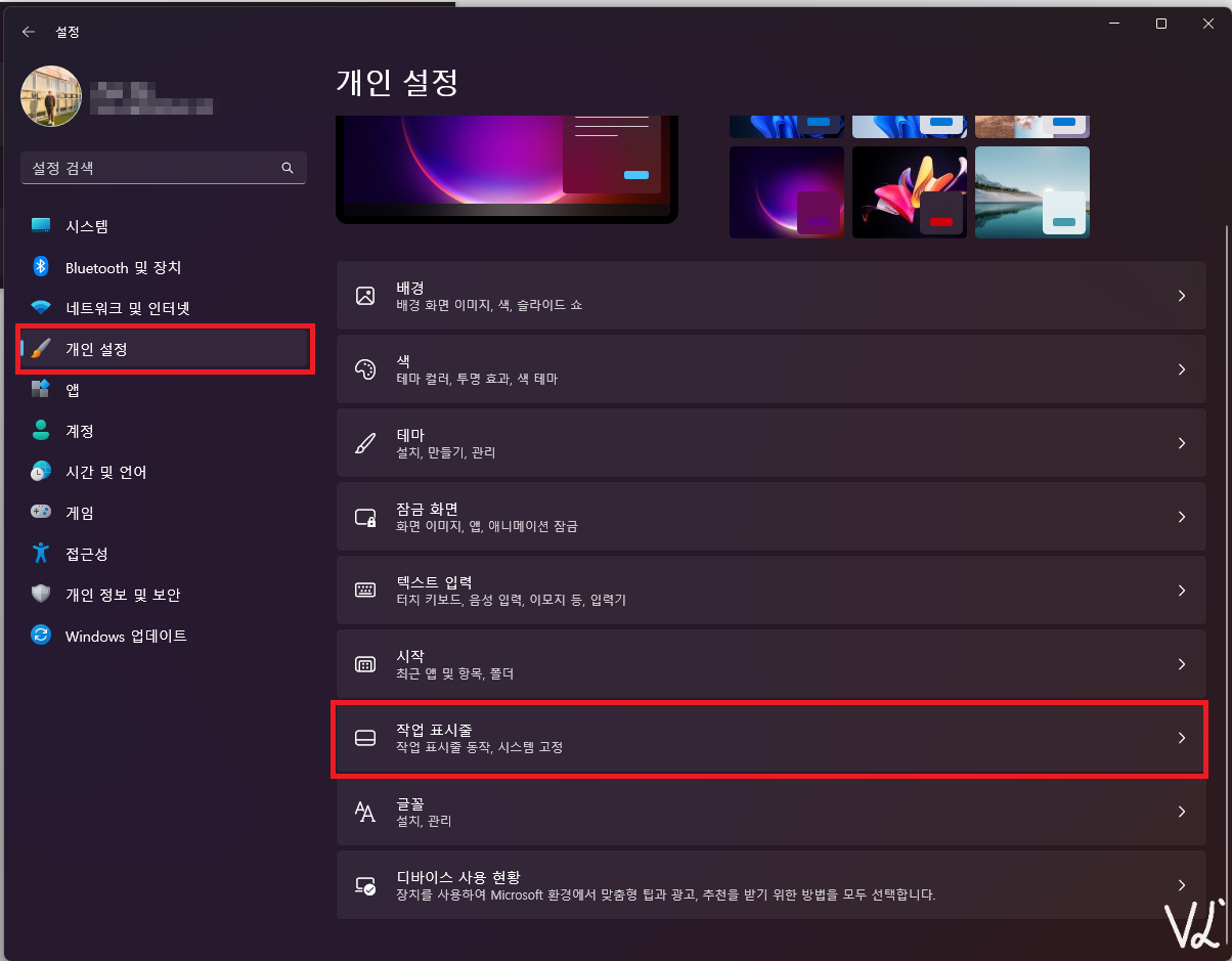 설정 창에서 개인 설정-작업표시줄을 들어가자.