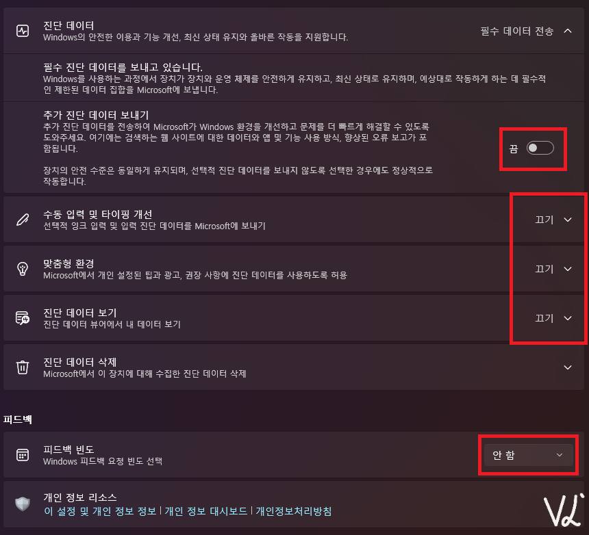 위처럼 전부 끄고 피드백 빈도를 안 함으로 만들어 주면 첫 번째 설정이 완료 된다.