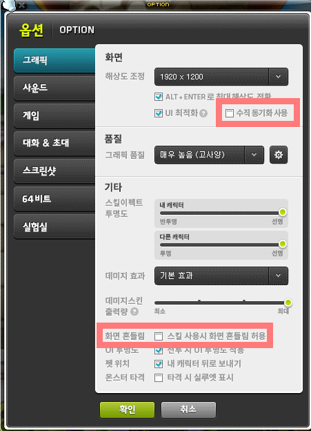 해상도 조정, 그래픽 품질은 본인 취향이지만 수직 동기화는 해제해주는 것이 좋다.