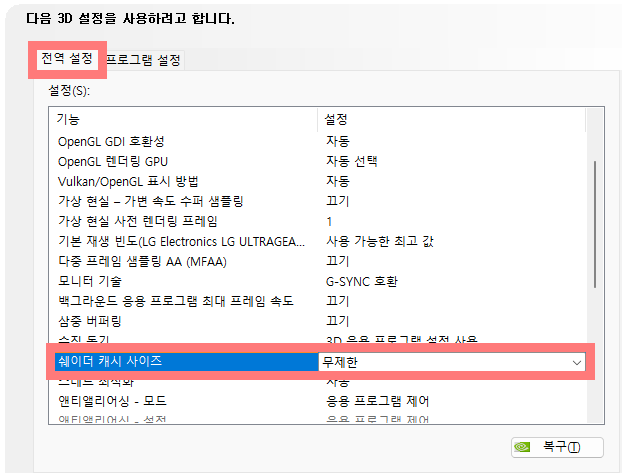 NVIDIA 제어판 - 3D 설정 - 전역 설정 - 쉐이더 캐시 사이즈 - 무제한