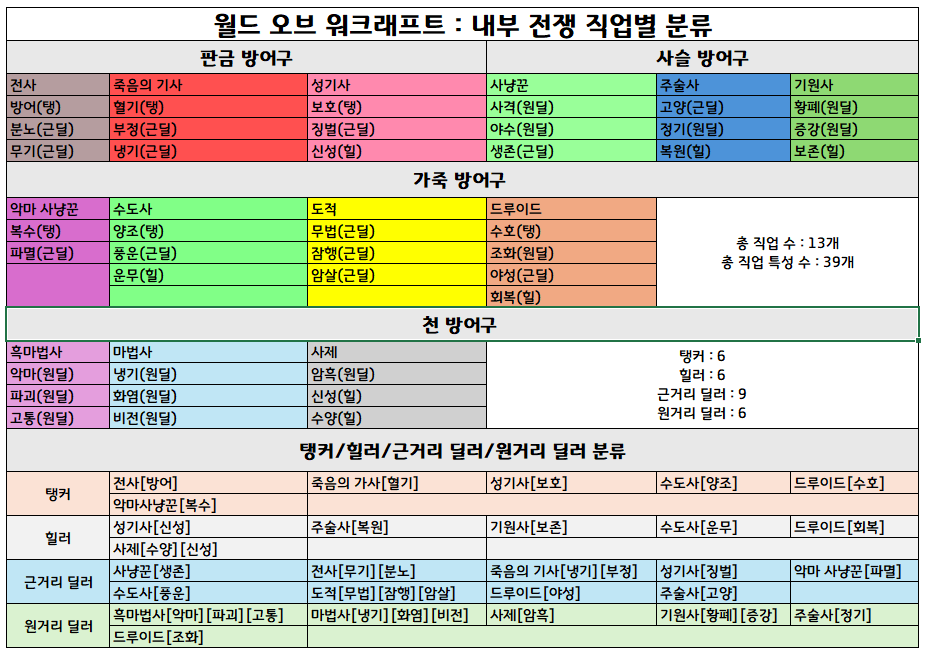 - 원딜: 마법사(냉기), 사제(암흑), 드루이드(조화), 흑마법사(파괴)