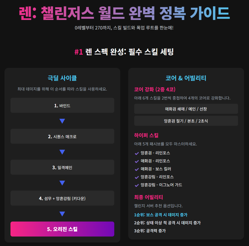 안녕하세요! 메이플스토리 챌린지 월드에서 신규 직업 '렌'을 육성 중인 분들을 위해, 0레벨부터 270레벨까지의 모든 정보를 압축한 완벽 공략 가이드를 준비했습니다.