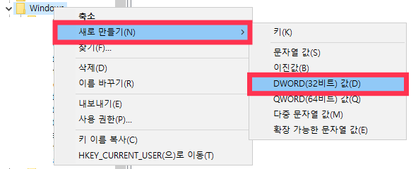 Windows Search를 오른쪽 클릭 – 새로 만들기(N) – DWORD(32비트) 값(D)을 누르면 Windows Search 창에 새 값 #1이 생긴다.