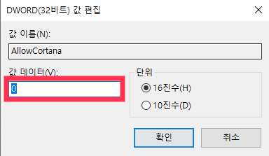 값 데이터가 0으로 되어 있으면 Cortana 기능을 끌 수 있다.