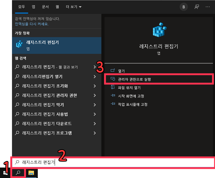 작업 표시줄 검색에 레지스트리 편집기 검색.